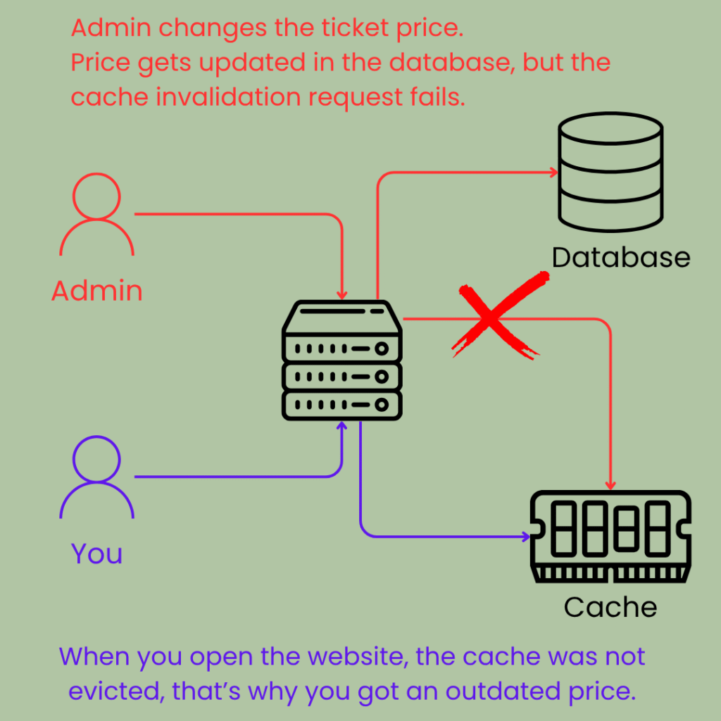 The consistency challenge is partly related to the previous one. Let’s imagine that the ticket price invalidation request did not fail and it went through. There would still be a period of time when the ticket price in the database ($20) would be different than the one in the cache ($10). This happens because the propagation of change takes time – from sub-second intervals, up to several seconds. When you checked the ticket price at exactly this window, you would be getting incorrect data, even though invalidation was successfully executed. This is called inconsistency period.